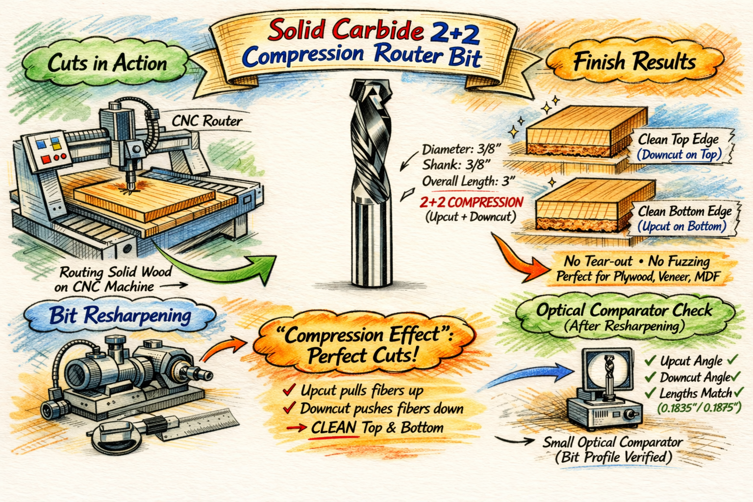 We understand cutting tool performance, geometry, and finish quality. Whether you are routing cabinet components, production wood parts, or precision mortises, this 2+2 compression bit is built to deliver clean results and long-term value.